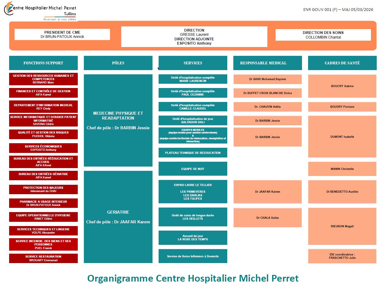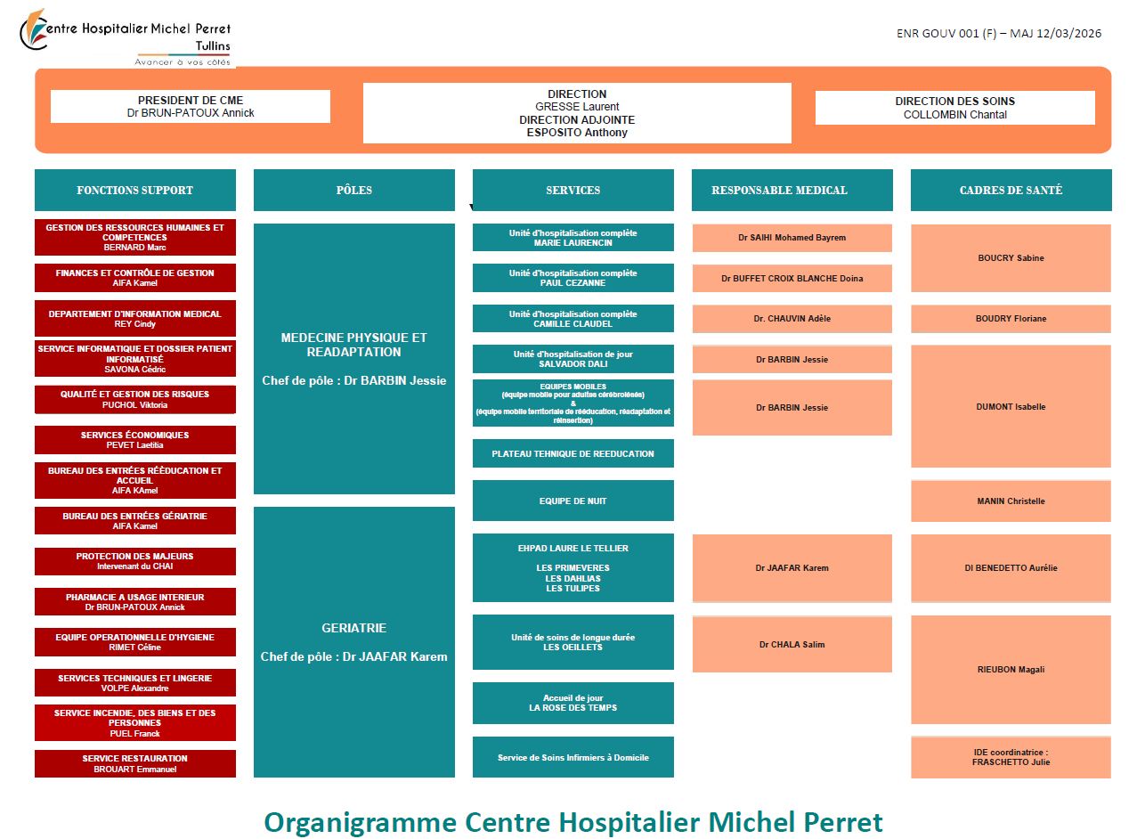 L'établissement est organisé autour de deux pôles de soins : le pôle médecine physique et réadaptation ainsi que le pôle Gériatrie. Un pôle support assure toutes les prestations administratives et logistiques.